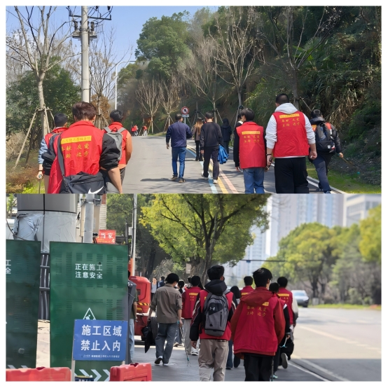 春日的青龙山步道绿意初绽,生机盎然。活动伊始,志愿者们在学校K4门集合整队,学工老师与同学们亲切合影留念,并叮嘱同学们牢记专业使命,在活动中注意安全,将环保理念与雷锋精神落实在点滴行动中。随后,师生队伍从学校西门出发,沿青龙山公园步道开展健步走活动。
