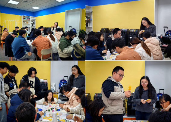 活动中,李情老师向同学们展示了3D打印工艺的制作流程,现场演示了从数字模型到实体成型的全过程。梅佳仪老师向同学们介绍传统掐丝珐琅的技艺与演变,并将前期由同学们自主设计并打印完成的钥匙扣底坯分发给大家后,正式进入掐丝珐琅上色环节。传统掐丝珐琅以铜丝盘曲为线、矿物釉料填充为彩,工序繁复、成本高昂。而本次活动巧妙地以3D打印技术模仿掐丝工艺,用精准的凸起线条替代手工铜丝,再以彩砂与AB胶调和模仿珐琅釉料的温润质感,将非遗技艺"翻译"成同学们可以亲手体验的创作过程。