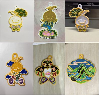 活动现场氛围热烈,同学们专注投入,在亲手为3D打印模型赋予珐琅色彩的过程中,进一步体会到传统文化与现代科技融合的魅力。活动最后,大家纷纷展示出自己精心制作的掐丝文创作品,一件件独具匠心的钥匙扣既承载了非遗文化的韵味,也凝聚了同学们对绿色生活的美好期许。